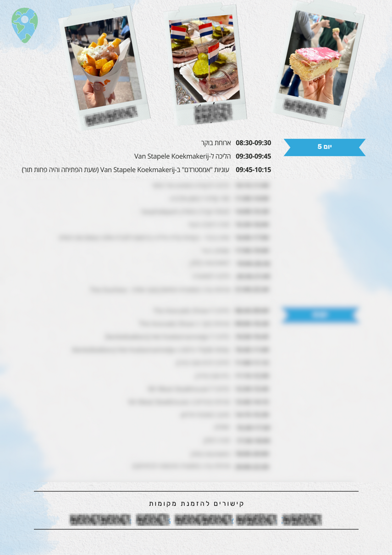 לכל יום בלו"ז, מצורפים הקישורים הרלוונטיים להזמנת אטרקציות ומקומות במסעדות.